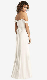 Add a Greco-Roman inspired look to your special event with this gorgeous full-length off-the-shoulder dress in soft lux chiffon. The pleated crisscross bodice design flows into a sash tie at the back waist, with draped off-the-shoulder accents creating the look of a mythical goddess. The flowing trumpet skirt features a front leg slit that accentuates every movement in this floor length bridesmaid dress.