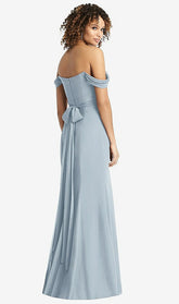 Add a Greco-Roman inspired look to your special event with this gorgeous full-length off-the-shoulder dress in soft lux chiffon. The pleated crisscross bodice design flows into a sash tie at the back waist, with draped off-the-shoulder accents creating the look of a mythical goddess. The flowing trumpet skirt features a front leg slit that accentuates every movement in this floor length bridesmaid dress.