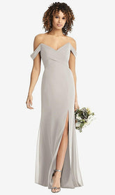 Add a Greco-Roman inspired look to your special event with this gorgeous full-length off-the-shoulder dress in soft lux chiffon. The pleated crisscross bodice design flows into a sash tie at the back waist, with draped off-the-shoulder accents creating the look of a mythical goddess. The flowing trumpet skirt features a front leg slit that accentuates every movement in this floor length bridesmaid dress.