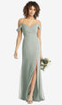 Add a Greco-Roman inspired look to your special event with this gorgeous full-length off-the-shoulder dress in soft lux chiffon. The pleated crisscross bodice design flows into a sash tie at the back waist, with draped off-the-shoulder accents creating the look of a mythical goddess. The flowing trumpet skirt features a front leg slit that accentuates every movement in this floor length bridesmaid dress.