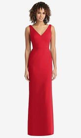 Capture a look of understated sophistication with this full-length V-neck gown in lux chiffon. Princess seams gently contour the lightly fitted V-neck bodice, while a modified trumpet skirt continues the slender profile. A plunging square back is cinched with a bow featuring long chiffon 'tails' that dance with each step in this sweet bridesmaid dress.