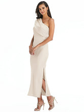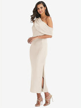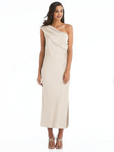 A graceful, draped neckline adds Grecian-inspired elegance to this convertible, one-shoulder slip dress. Delicate lux charmeuse fabric forms a sleek silhouette and flowing midi skirt with an alluring side slit.