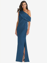 A graceful, draped neckline adds Grecian-inspired elegance to this convertible, one-shoulder slip dress. Delicate lux charmeuse fabric forms a sleek silhouette and flowing maxi skirt that reaches the ground, giving a formal look for evening events. An alluring side slit lends an extra touch.
