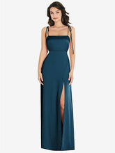 Show off your shoulders with the delicate tie straps featured on this whisper satin gown. A flowing silhouette is highlighted with a modified circle skirt with a slit and a flexible waist that hugs your shape. Perfect for dinner, dancing, and making merry from afternoon to late night.