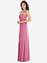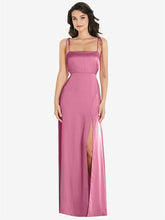 Show off your shoulders with the delicate tie straps featured on this whisper satin gown. A flowing silhouette is highlighted with a modified circle skirt with a slit and a flexible waist that hugs your shape. Perfect for dinner, dancing, and making merry from afternoon to late night.