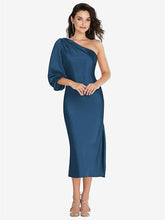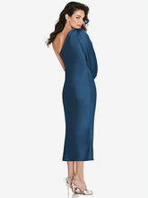 Pairing a one-shoulder silhouette and a billowing bishop sleeve, this lux charmeuse bias dress is a modern look with classical elegance. A formal look perfect for weddings and sophisticated gatherings, this midi dress boasts a tea-length hem with a side slit that's just right for dancing.