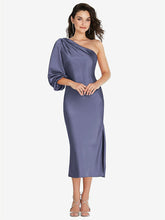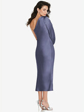 Pairing a one-shoulder silhouette and a billowing bishop sleeve, this lux charmeuse bias dress is a modern look with classical elegance. A formal look perfect for weddings and sophisticated gatherings, this midi dress boasts a tea-length hem with a side slit that's just right for dancing.