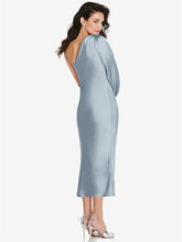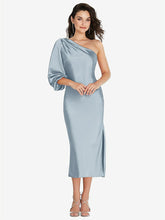 Pairing a one-shoulder silhouette and a billowing bishop sleeve, this lux charmeuse bias dress is a modern look with classical elegance. A formal look perfect for weddings and sophisticated gatherings, this midi dress boasts a tea-length hem with a side slit that's just right for dancing.