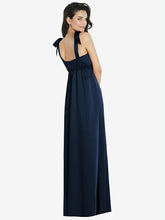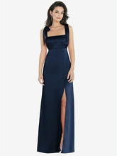 Bows at the shoulders add a sweet finishing touch to this gorgeous lux charmeuse gown. A square neckline flatters while a modern empire waist and soft elastic across the back create definition. A high slit in a classic A-line maxi skirt makes an impact as you put your best foot forward.