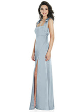 Bows at the shoulders add a sweet finishing touch to this gorgeous lux charmeuse gown. A square neckline flatters while a modern empire waist and soft elastic across the back create definition. A high slit in a classic A-line maxi skirt makes an impact as you put your best foot forward.