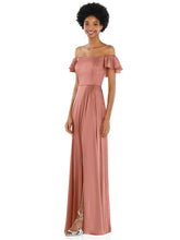 Glide down the aisle or across the dance floor in this eye-catching whisper satin gown. An off-the-shoulder silhouette with ruffled sleeves perfectly balances the flowing elegance of an A-line maxi skirt with a slit perfect for strutting your stuff.