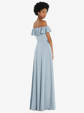 Glide down the aisle or across the dance floor in this eye-catching whisper satin gown. An off-the-shoulder silhouette with ruffled sleeves perfectly balances the flowing elegance of an A-line maxi skirt with a slit perfect for strutting your stuff.