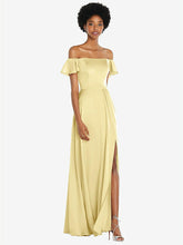 Glide down the aisle or across the dance floor in this eye-catching whisper satin gown. An off-the-shoulder silhouette with ruffled sleeves perfectly balances the flowing elegance of an A-line maxi skirt with a slit perfect for strutting your stuff.