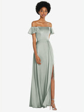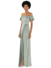 Glide down the aisle or across the dance floor in this eye-catching whisper satin gown. An off-the-shoulder silhouette with ruffled sleeves perfectly balances the flowing elegance of an A-line maxi skirt with a slit perfect for strutting your stuff.