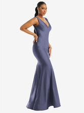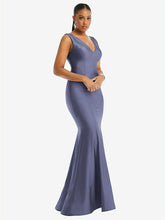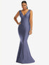 Vaughn — Make a dramatic entrance to a party wearing this floor-length V-neck dress, complete with delicately shirred shoulders and a dramatic gored mermaid skirt with a subtle train. This sleeveless mermaid gown is cut from luxe stretch satin that lends a sheen that enhances the hourglass silhouette. Includes optional sew-in cups that provide extra coverage.