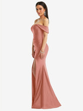 Scarlet — Step out in this striking off-the-shoulder floor-length gown, made from a luxe stretch satin that offers a glossy glow. Draped cap sleeves hang loosely while a corset bodice enhances an hourglass silhouette, while optional cups provide extra support and coverage. A sweeping pleated mermaid skirt with a subtle train and alluring front slit creates an unforgettable look.