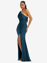 Portia — Step out in this modern full-length gown, designed with an asymmetrical, shirred cowl neckline that reveals the shoulder. A floor-skimming mermaid skirt with a slight train lends movement and a dramatic sheen to the luxe stretch satin fabric. This sleek one-shoulder gown also comes with optional cups for additional coverage.
