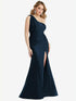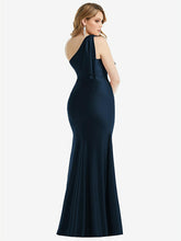 【STYLE: CS108】Cascading Bow One-Shoulder Stretch Satin Mermaid Dress with Slight Train【COLOR: Midnight Navy】