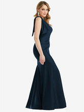 Zaara — An asymmetrical cascading tie-shoulder elegantly folds down this floor-length gown. Cut from a luminous luxe stretch satin material, this glamorous gown features a voluminous horsehair hem and godets. With each step, the dramatic mermaid skirt with subtle train sweeps across the floor while a front side slit lends a stunning reveal. Optional sew-in cups provide extra support and coverage.
