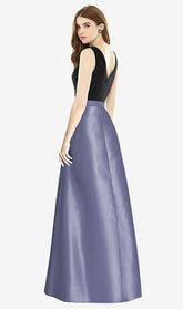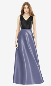 A flattering silhouette with v-necklines in front and back defines the form of this full-length sleeveless satin twill dress. Side pockets and a waist at its natural front add livability to an expressive, elegant style. Available in any color combination satin twill bodice and skirt or as solid.