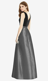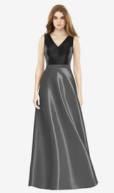 A flattering silhouette with v-necklines in front and back defines the form of this full-length sleeveless satin twill dress. Side pockets and a waist at its natural front add livability to an expressive, elegant style. Available in any color combination satin twill bodice and skirt or as solid.