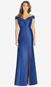 【STYLE: D760】Off-the-Shoulder Cuff Trumpet Gown with Front Slit【COLOR: Classic Blue】