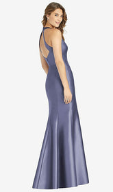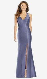 Sleek, alluring satin twill is a magnificent choice for this modern, full-length dress with a modifier halter V-neck silhouette. Graceful on a formal occasion, the gown boasts a beautiful trumpet skirt highlighted by a long, daring side slit.