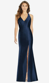 Sleek, alluring satin twill is a magnificent choice for this modern, full-length dress with a modifier halter V-neck silhouette. Graceful on a formal occasion, the gown boasts a beautiful trumpet skirt highlighted by a long, daring side slit.