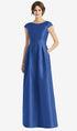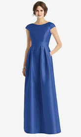 Full-length satin twill dress with bateau neckline and cap sleeve. Pleated skirt with pockets.