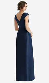 Full-length satin twill dress with bateau neckline and cap sleeve. Pleated skirt with pockets.