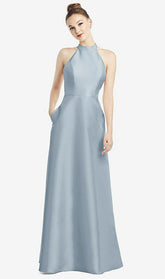A full length, satin twill dress kisses the earth you walk on while charming slash pockets make a nonchalant, carefree statement. A plunging open back and high banded neckline along the halter adds a sophisticated finish.