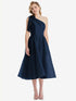 A tea-length pleated skirt makes this beautiful midi dress the perfect choice for your next semi-formal occasion. It draws all eyes with a one-shoulder bodice complete with a scarf tie that softens the look to perfection.