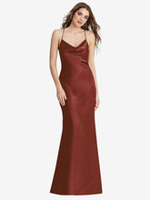 Pairing a maxi length skirt with a delicate cowl neck, this slip dress is simply stunning for any formal occasion. It shows off lush lux charmeuse fabric with a bias cut skirt that creates lovely movement. Delicate spaghetti straps are convertible, creating either a halter top or a crisscross back.