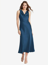 Flowing like water, this gorgeous cowl neck dress creates an aura of sophistication. Lux charmeuse fabric complements tank-style straps and a midi length bias skirt that bring a fun flirty touch to this semi-formal design.