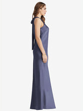 Everyone will notice when you turn your back to reveal the dramatic keyhole detail of this lux charmeuse maxi dress. Flowing fabric is highlighted with a jewel neckline and flowing skirt that lend a sophisticated touch. A simple tie behind the neck creates its peek-a-boo detail and adds a feminine touch.