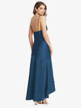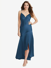 Spaghetti straps and a bikini-inspired top add flirty, inviting style to this full length lux charmeuse dress. A drop waist highlights its asymmetrical seaming and slitted high-low skirt, which create beautiful movement and energy for an elegant design.