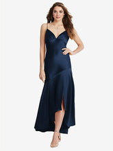 Spaghetti straps and a bikini-inspired top add flirty, inviting style to this full length lux charmeuse dress. A drop waist highlights its asymmetrical seaming and slitted high-low skirt, which create beautiful movement and energy for an elegant design.