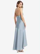 Spaghetti straps and a bikini-inspired top add flirty, inviting style to this full length lux charmeuse dress. A drop waist highlights its asymmetrical seaming and slitted high-low skirt, which create beautiful movement and energy for an elegant design.