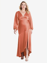 Puff sleeves emphasize the movement and energy of this full length, high-low slip dress. Crafted from soft, flowing lux charmeuse, the dress boasts a deep V-neck with delicate shirring at the bodice and a drop waist. Asymmetric seaming perfectly accentuates a slitted, high-low skirt.