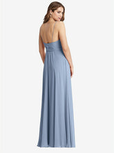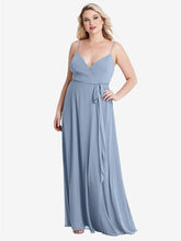 Pairing a classic formal silhouette with lovely, light lux chiffon fabric, this maxi wrap dress is sure to please for a everything from prom to a wedding to a sophisticated cocktail party. A sleek sash ties at the hip, emphasizing the flowing energy of a full circle skirt. A V-neck and delicate spaghetti straps pair with a low ballet back.