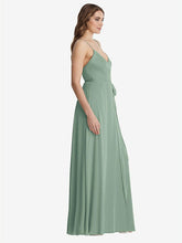 Pairing a classic formal silhouette with lovely, light lux chiffon fabric, this maxi wrap dress is sure to please for a everything from prom to a wedding to a sophisticated cocktail party. A sleek sash ties at the hip, emphasizing the flowing energy of a full circle skirt. A V-neck and delicate spaghetti straps pair with a low ballet back.