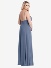 Delicate and flowing, this square neck maxi dress is a formal design that embraces elegance and movement. Sleek spaghetti straps and a low ballet back are emphasized with a beautiful full circle skirt with a high slit that adds modern appeal.