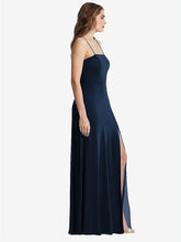 Delicate and flowing, this square neck maxi dress is a formal design that embraces elegance and movement. Sleek spaghetti straps and a low ballet back are emphasized with a beautiful full circle skirt with a high slit that adds modern appeal.
