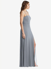 Delicate and flowing, this square neck maxi dress is a formal design that embraces elegance and movement. Sleek spaghetti straps and a low ballet back are emphasized with a beautiful full circle skirt with a high slit that adds modern appeal.