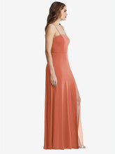 Delicate and flowing, this square neck maxi dress is a formal design that embraces elegance and movement. Sleek spaghetti straps and a low ballet back are emphasized with a beautiful full circle skirt with a high slit that adds modern appeal.