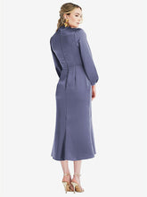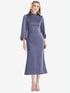 Cut from a smooth lux charmeuse fabric, this romantic calf-length midi dress features a tailored modified trumpet skirt with an elegant and subtle flair. Billowing bishop sleeves and a high band collar make this midi dress more sophisticated and lend a formal appearance to its casual style, making it perfect for spring and summer weddings or formal daytime events.