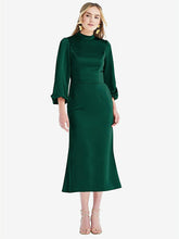 Cut from a smooth lux charmeuse fabric, this romantic calf-length midi dress features a tailored modified trumpet skirt with an elegant and subtle flair. Billowing bishop sleeves and a high band collar make this midi dress more sophisticated and lend a formal appearance to its casual style, making it perfect for spring and summer weddings or formal daytime events.