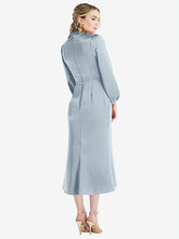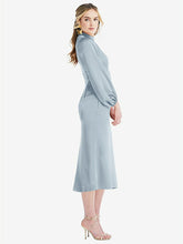 Cut from a smooth lux charmeuse fabric, this romantic calf-length midi dress features a tailored modified trumpet skirt with an elegant and subtle flair. Billowing bishop sleeves and a high band collar make this midi dress more sophisticated and lend a formal appearance to its casual style, making it perfect for spring and summer weddings or formal daytime events.