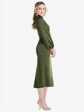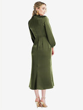 Cut from a smooth lux charmeuse fabric, this romantic calf-length midi dress features a tailored modified trumpet skirt with an elegant and subtle flair. Billowing bishop sleeves and a high band collar make this midi dress more sophisticated and lend a formal appearance to its casual style, making it perfect for spring and summer weddings or formal daytime events.