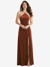Show off your shoulders in this flirty halter maxi dress with pockets. Lustrous lux velvet flows sumptuously from its high halter neckline to its modified circle skirt?a thigh-high slit rounds out this alluring design.